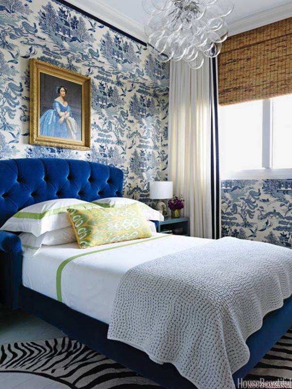 Phòng ngủ chìm trong sắc coban với tường giấy họa tiết cầu kỳ, chiếc giường xanh đậm làm điểm nhấn bắt mắt. Tuy vậy, chủ nhà đã biết cân bằng không gian với bộ ga trải giường, màn che và nền nhà trắng sáng màu.