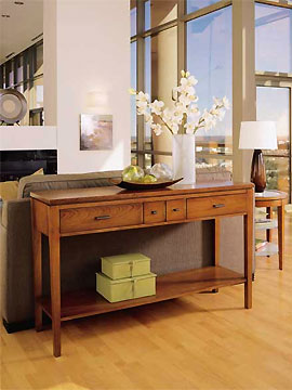 Một số sản phẩm tủ và bàn dành cho phòng khách mang phong cách hiện đại với chất liệu gỗ tự nhiên do các kiến trúc sư người Mỹ thiết kế. Không gian tiếp khách của bạn cũng có thể "chơi" những sản phẩm này nếu tìm được vị trí phù hợp. Nên kết hợp nhiều đồ trang trí để tạo thêm vẻ ấn tượng